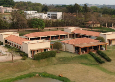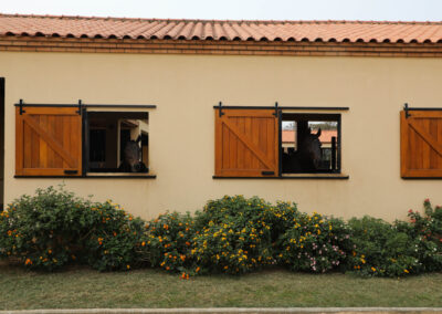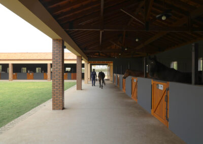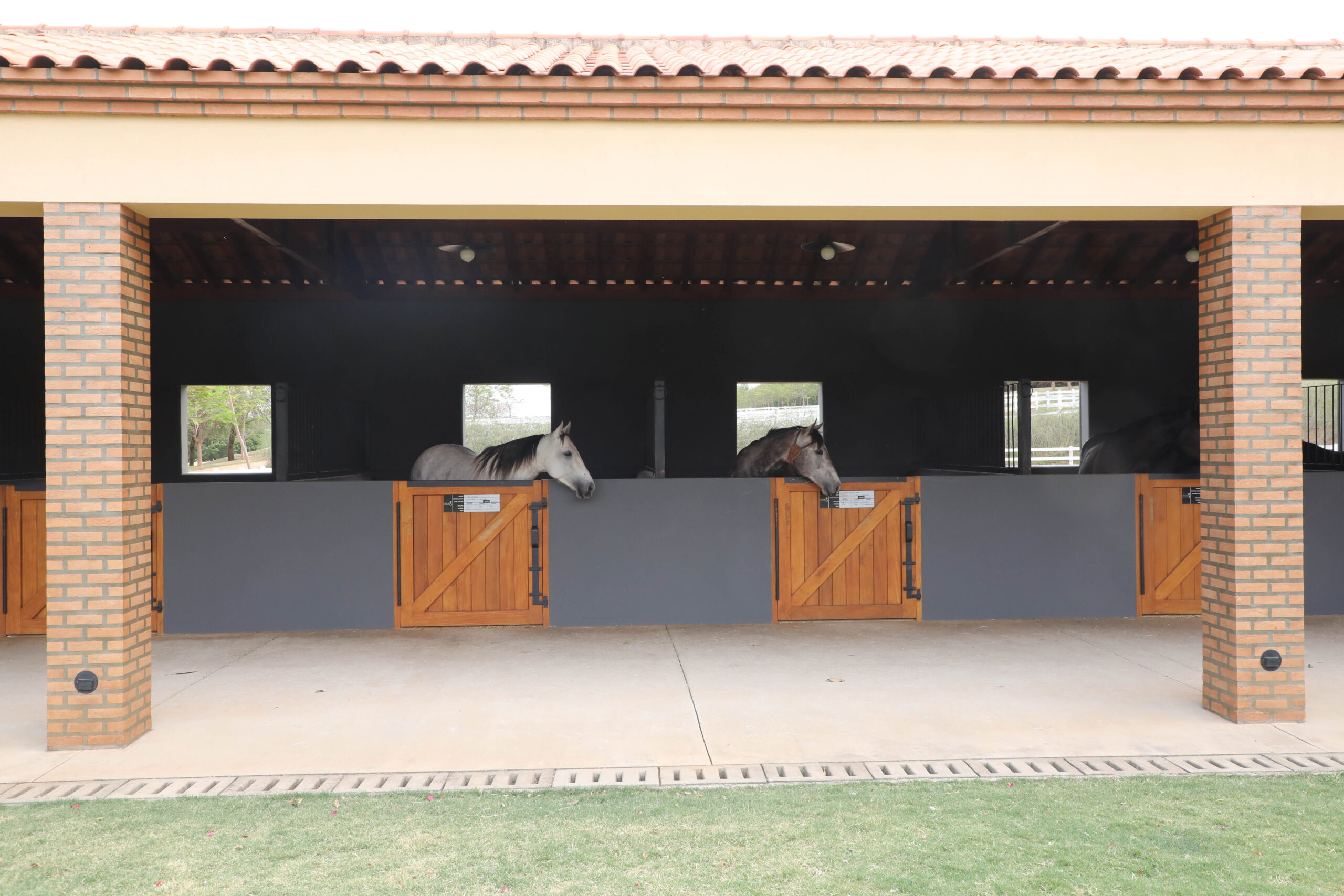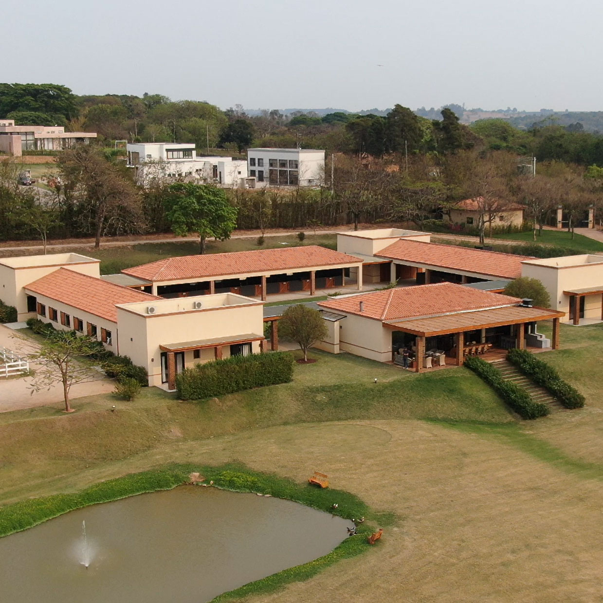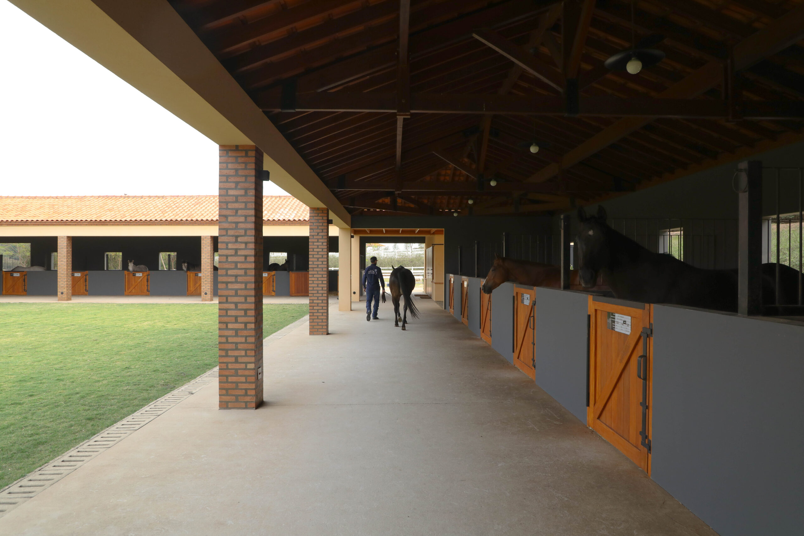 Este proyecto fue concebido para un reconocido haras de caballos cuarto de milla en Brasil. Desde el inicio se buscó crear una caballeriza funcional y cálida, pensada para el día a día, donde la madera, el ladrillo y el paisaje se combinan para darle identidad y arraigo al lugar. La organización general se articula en torno a un patio central, que aporta ritmo y aire, y al mismo tiempo ordena las circulaciones. La caballeriza cuenta con un área social abierta hacia el campo, generando un espacio íntimamente conectado con la vida ecuestre. En las esquinas se ubican los departamentos para huéspedes y el escritorio del propietario, todos con vistas abiertas al campo. El diseño de las circulaciones fue clave: los recorridos peatonales se diferencian de los de caballos y los automóviles llegan únicamente hasta el estacionamiento, asegurando claridad y practicidad en el funcionamiento diario. Las pérgolas de madera acompañan estos recorridos y aportan unidad al conjunto.