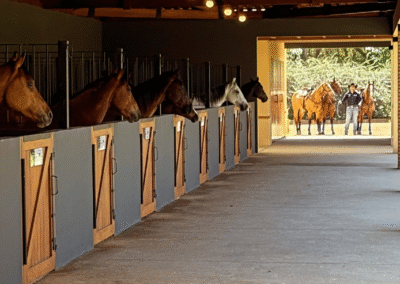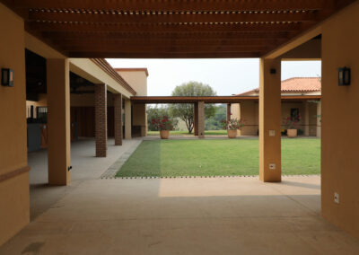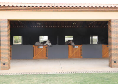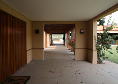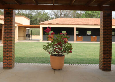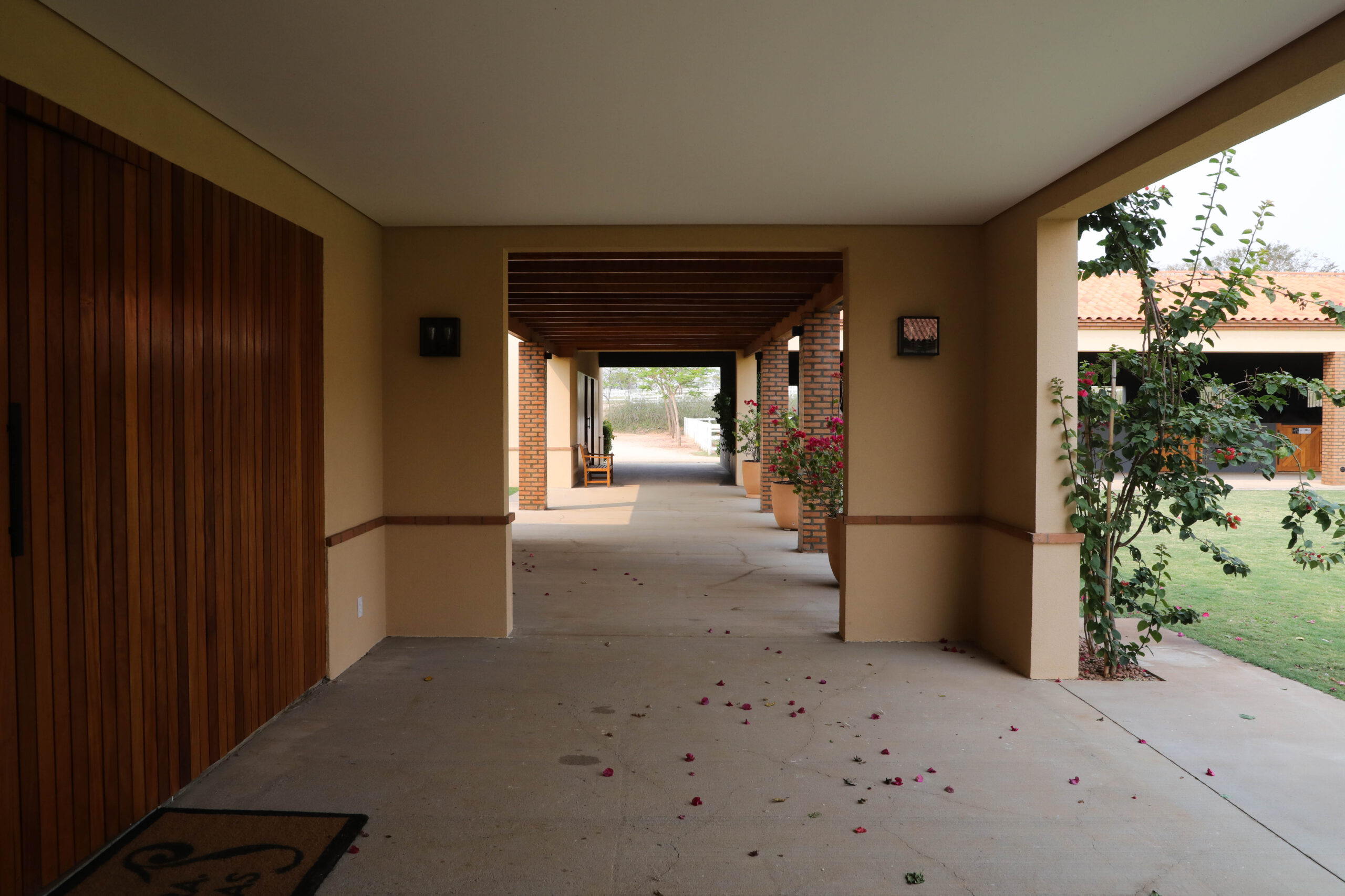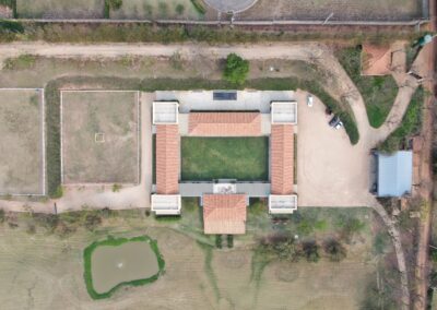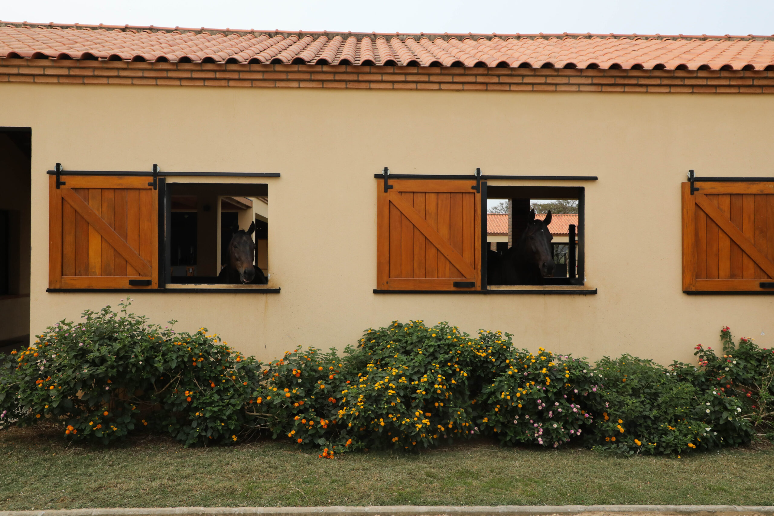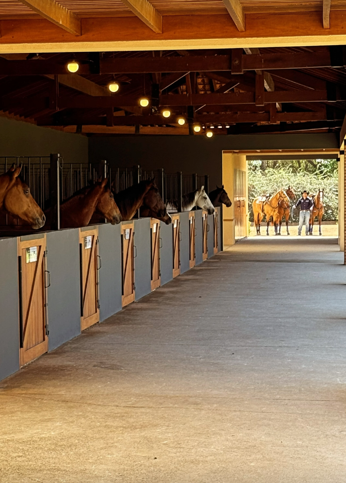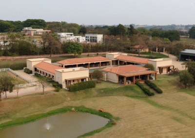 Este proyecto fue concebido para un reconocido haras de caballos cuarto de milla en Brasil. Desde el inicio se buscó crear una caballeriza funcional y cálida, pensada para el día a día, donde la madera, el ladrillo y el paisaje se combinan para darle identidad y arraigo al lugar. La organización general se articula en torno a un patio central, que aporta ritmo y aire, y al mismo tiempo ordena las circulaciones. La caballeriza cuenta con un área social abierta hacia el campo, generando un espacio íntimamente conectado con la vida ecuestre. En las esquinas se ubican los departamentos para huéspedes y el escritorio del propietario, todos con vistas abiertas al campo. El diseño de las circulaciones fue clave: los recorridos peatonales se diferencian de los de caballos y los automóviles llegan únicamente hasta el estacionamiento, asegurando claridad y practicidad en el funcionamiento diario. Las pérgolas de madera acompañan estos recorridos y aportan unidad al conjunto.