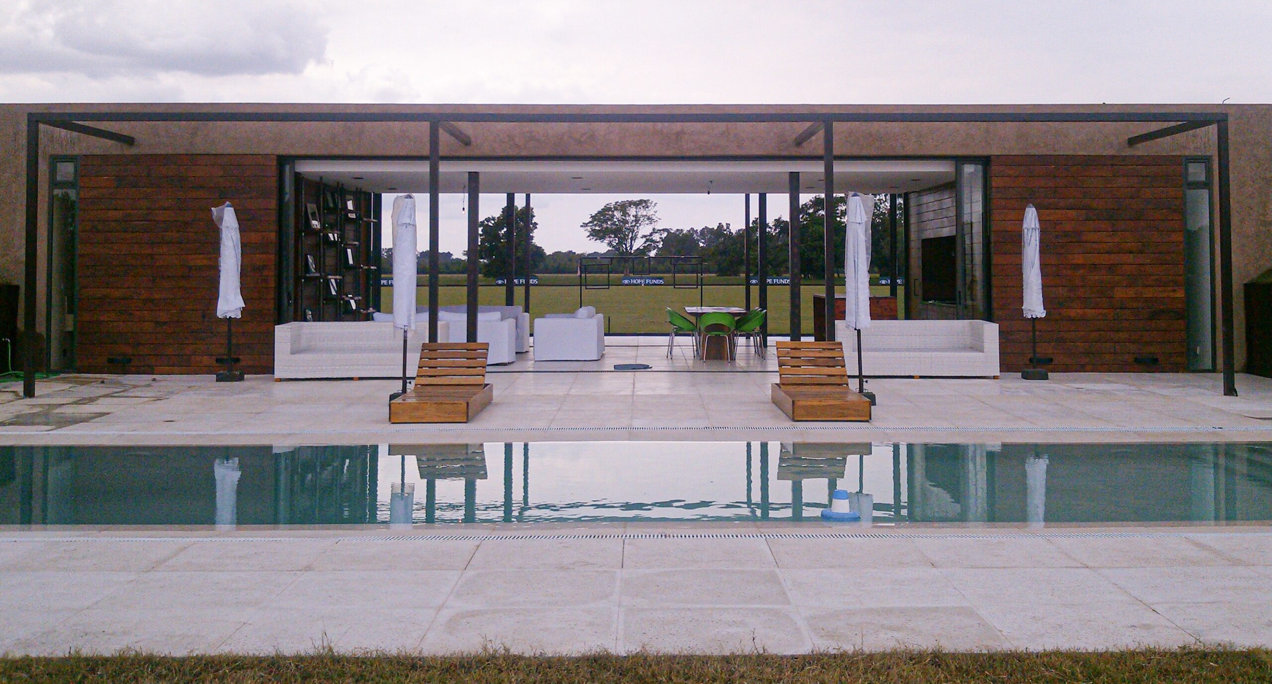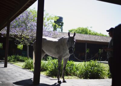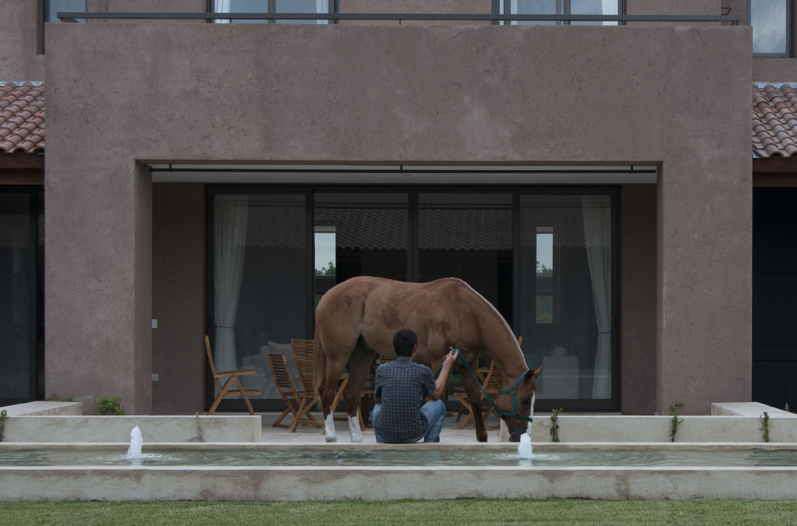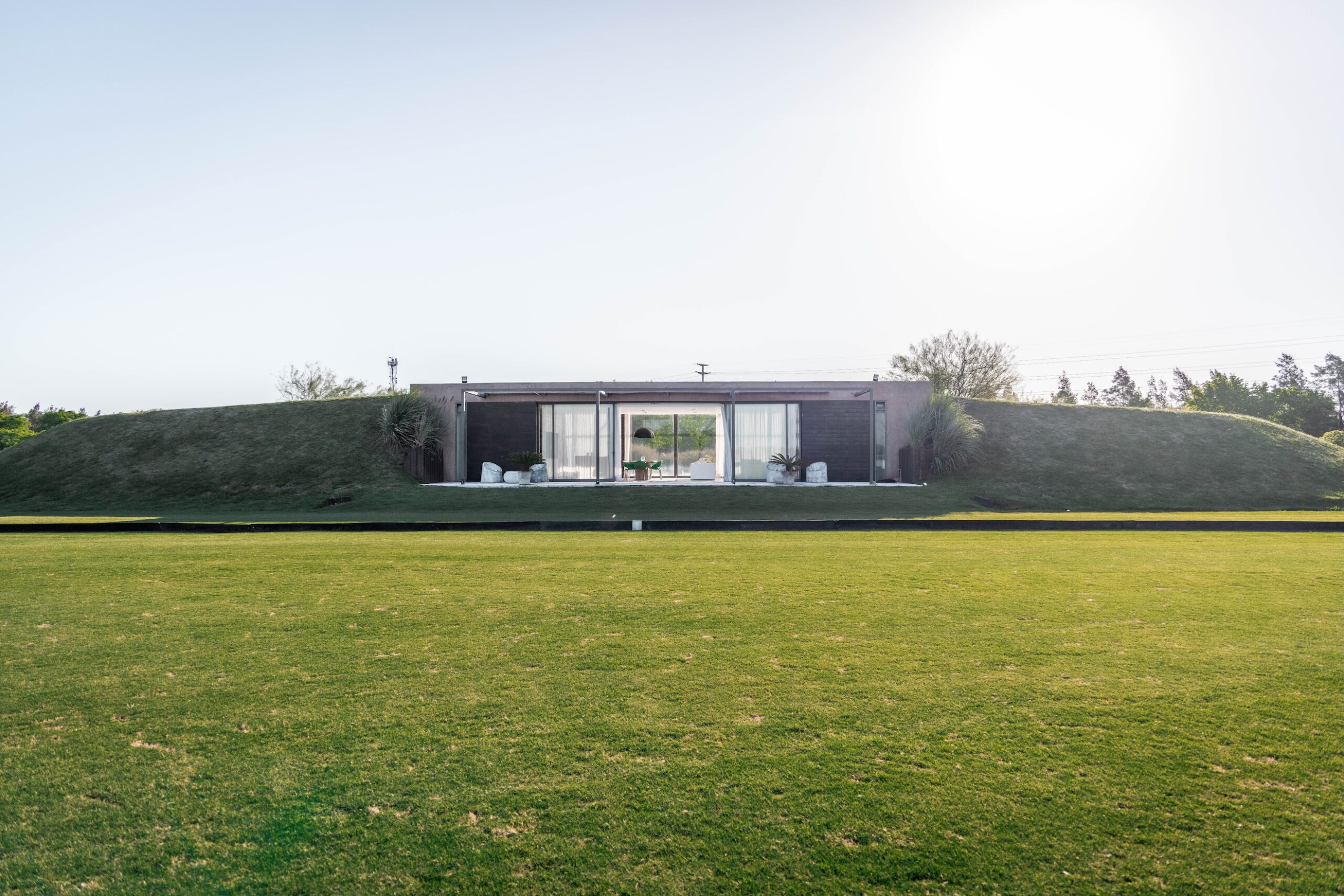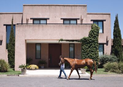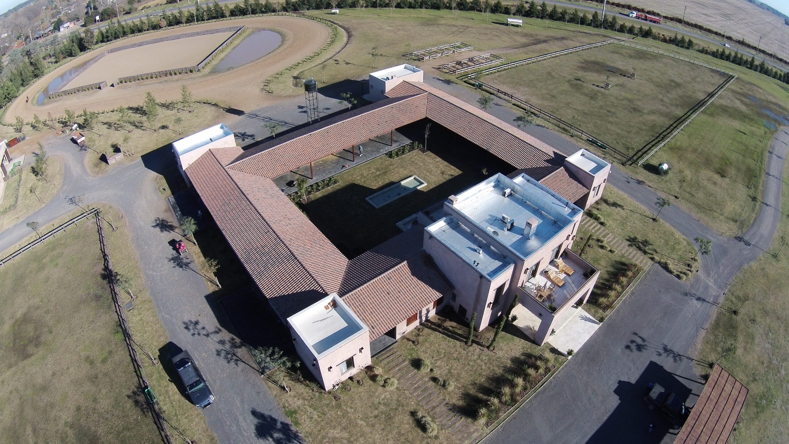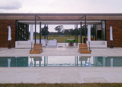 La Indiana Polo Club fue creado con la idea de generar dos espacios bien diferenciados: por un lado, la caballeriza y, por el otro, el clubhouse, reservado como un lugar social y privado independiente de la vida diaria de las caballerizas. En la caballeriza se diseñó un área social central para recibir invitados, con planta baja integrada al movimiento ecuestre y planta alta con departamentos. La organización se resolvió en forma de O, con un patio central y una fuente, mientras que todos los servicios y circulaciones quedaron hacia el exterior, garantizando orden y practicidad. El clubhouse, en cambio, fue concebido como un refugio privado en forma de C, abrazando un patio con pileta y protegido bajo un talud verde, lo que genera un ámbito íntimo y reservado para los propietarios.