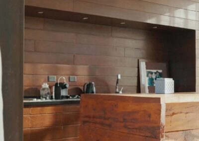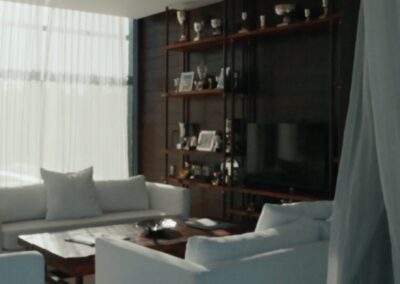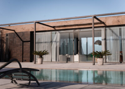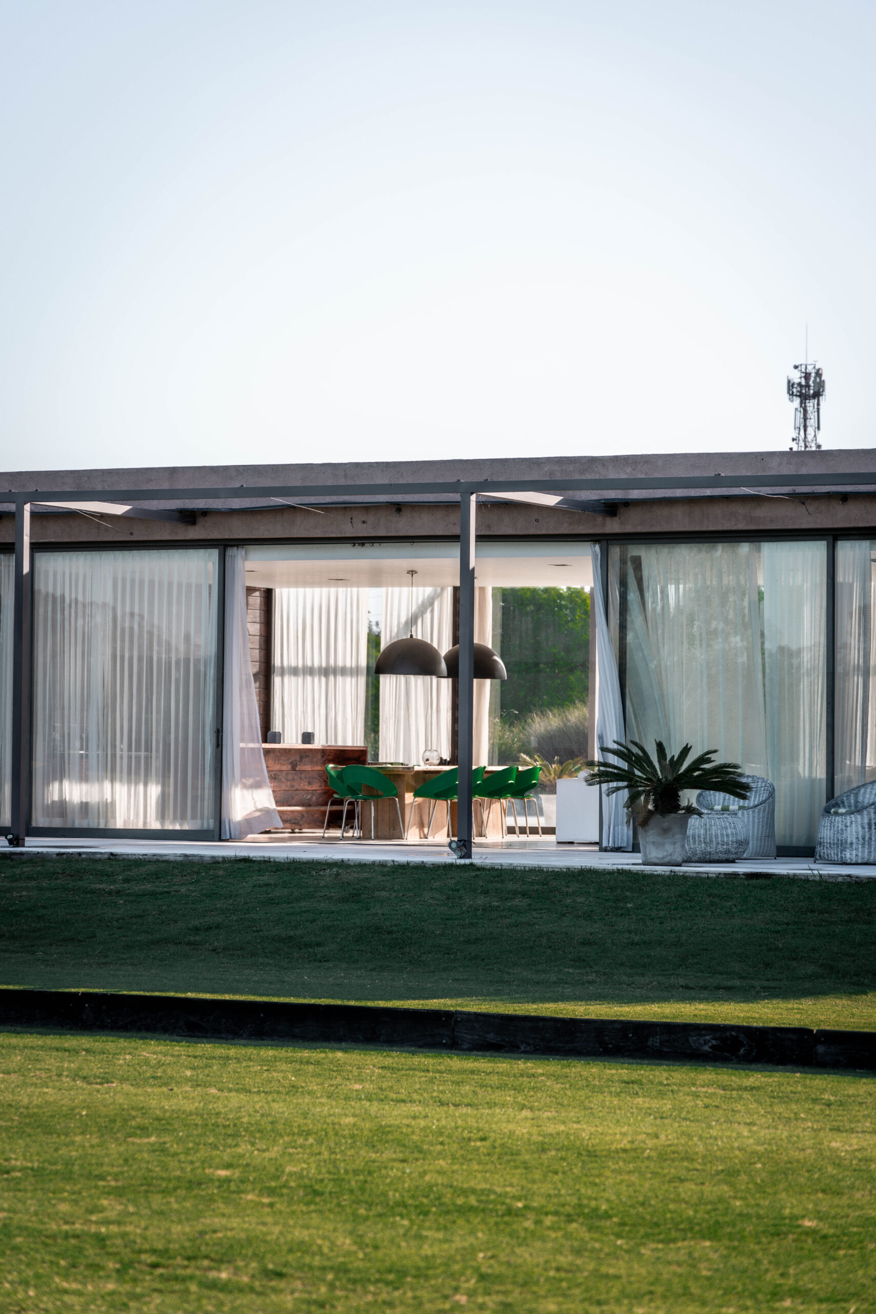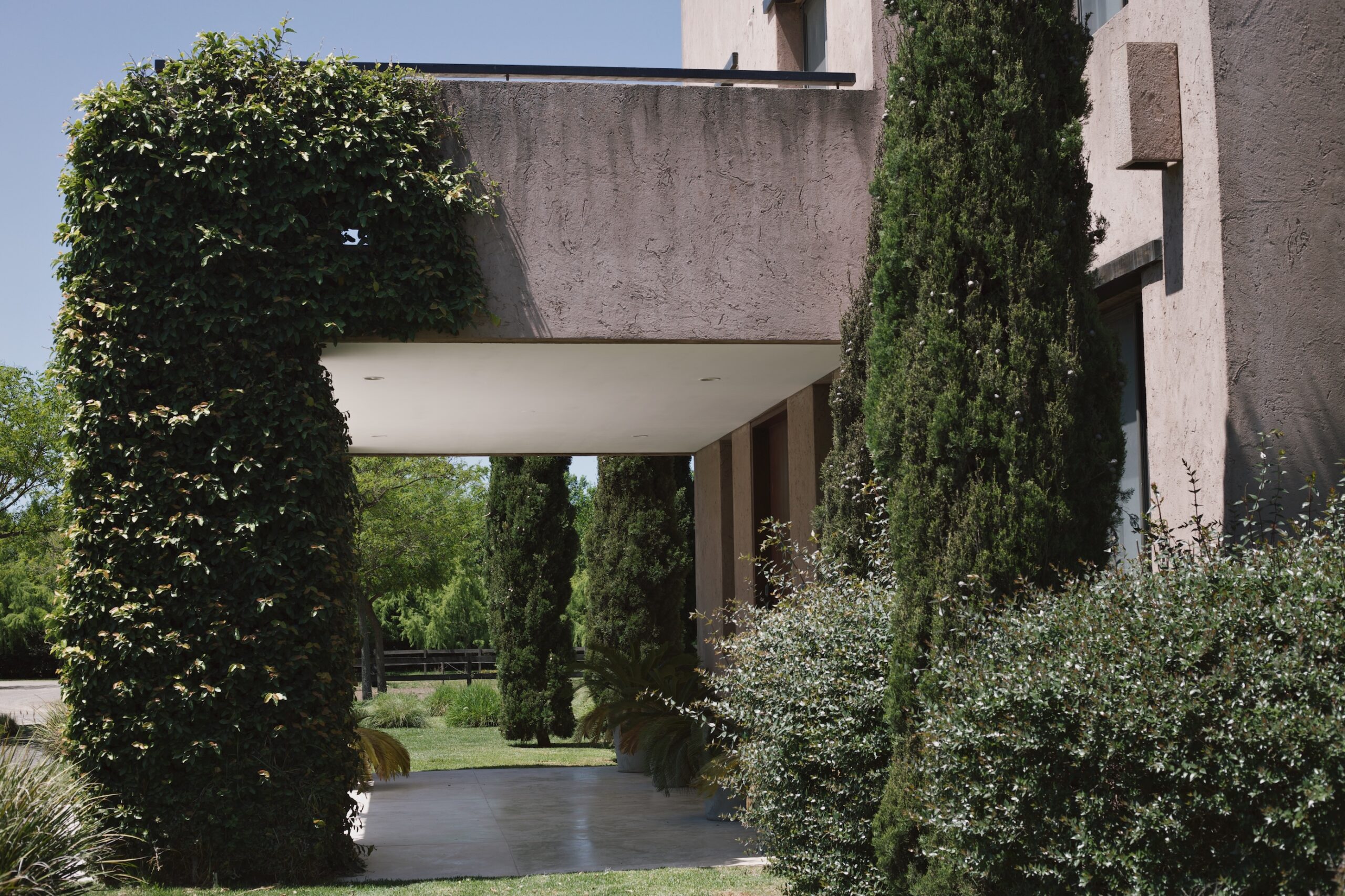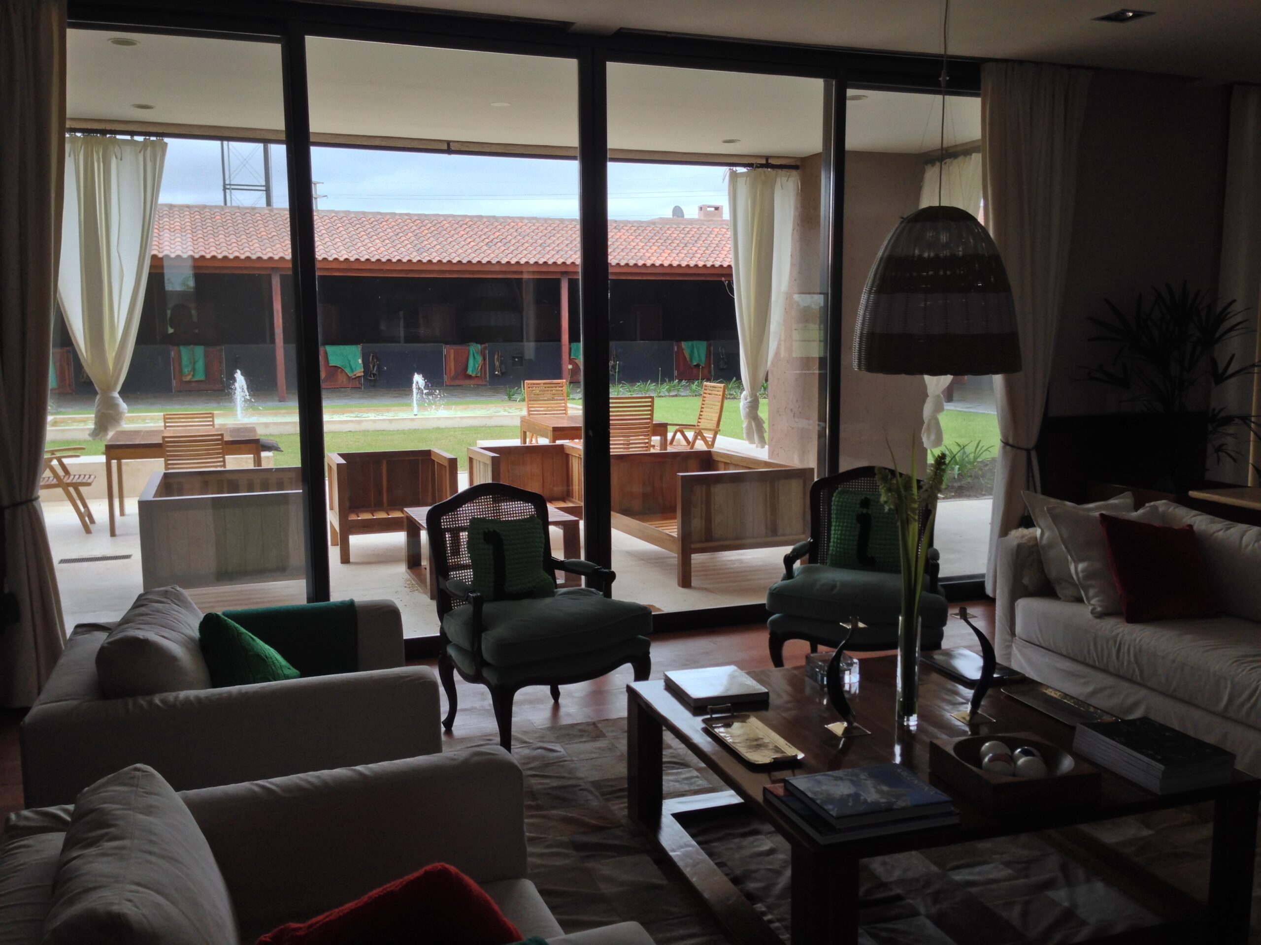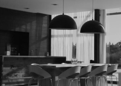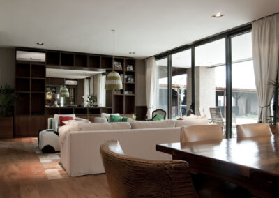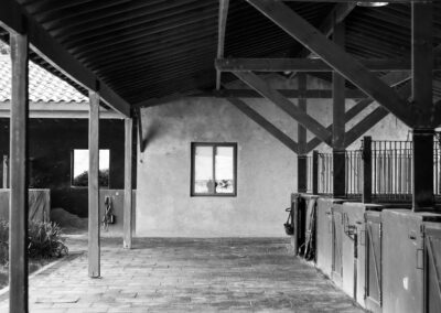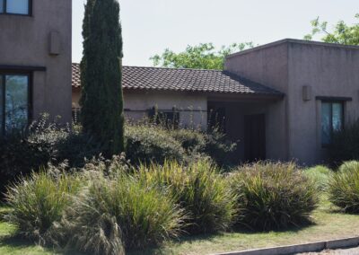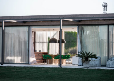 La Indiana Polo Club fue creado con la idea de generar dos espacios bien diferenciados: por un lado, la caballeriza y, por el otro, el clubhouse, reservado como un lugar social y privado independiente de la vida diaria de las caballerizas. En la caballeriza se diseñó un área social central para recibir invitados, con planta baja integrada al movimiento ecuestre y planta alta con departamentos. La organización se resolvió en forma de O, con un patio central y una fuente, mientras que todos los servicios y circulaciones quedaron hacia el exterior, garantizando orden y practicidad. El clubhouse, en cambio, fue concebido como un refugio privado en forma de C, abrazando un patio con pileta y protegido bajo un talud verde, lo que genera un ámbito íntimo y reservado para los propietarios.