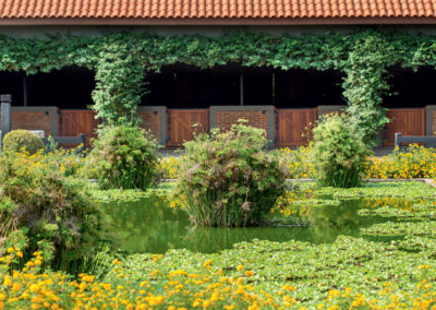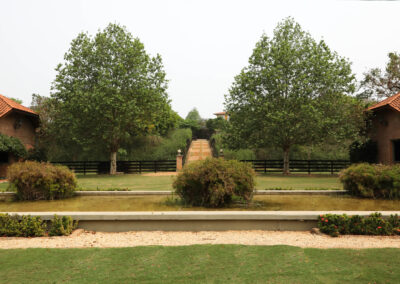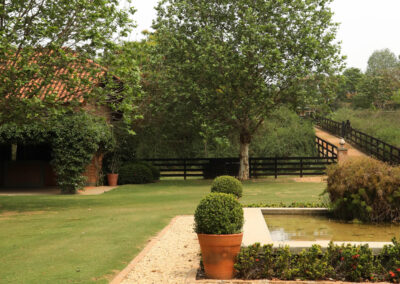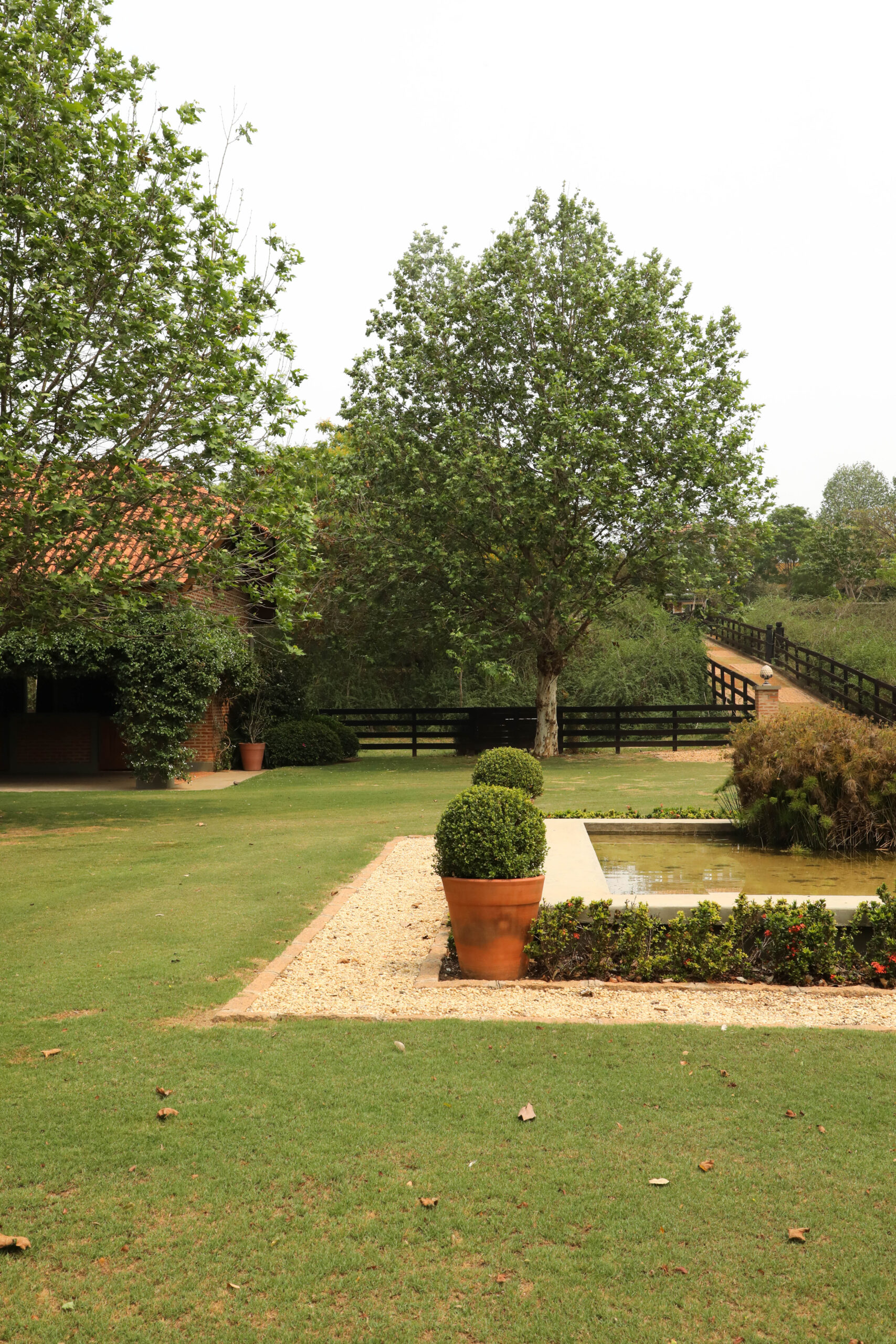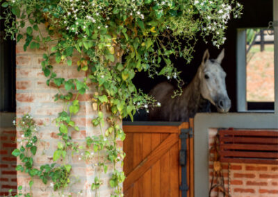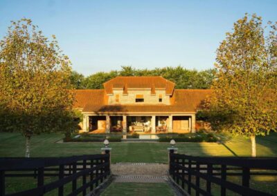 Maragata Polo Club fue el primer proyecto internacional del estudio. Un encargo muy especial para la familia Bastos, una gran familia que siempre apoyó y confió en nuestro trabajo. El proyecto respondió al desafío de crear una caballeriza de 40 boxes que funcionara de manera eficiente y con identidad propia. La caballeriza cuenta con un área social en planta baja y viviendas en planta superior, lo que refuerza su carácter de club familiar y contenido. Se optó por un diseño de estilo inglés, siguiendo la impronta buscada por la familia, y se resolvió en forma de C: con todos los boxes y la fuente central orientados hacia el interior, mientras que los servicios y estacionamientos se organizaron hacia el exterior. La caballeriza se abre a un pasillo central que conecta directamente con la cancha de polo, implantada en un terreno más alto y vinculada visualmente con todo el conjunto. El proyecto incluyó también el diseño de paisajismo a cargo de Roberto Riscala, que reforzó la integración entre la arquitectura y el entorno natural.