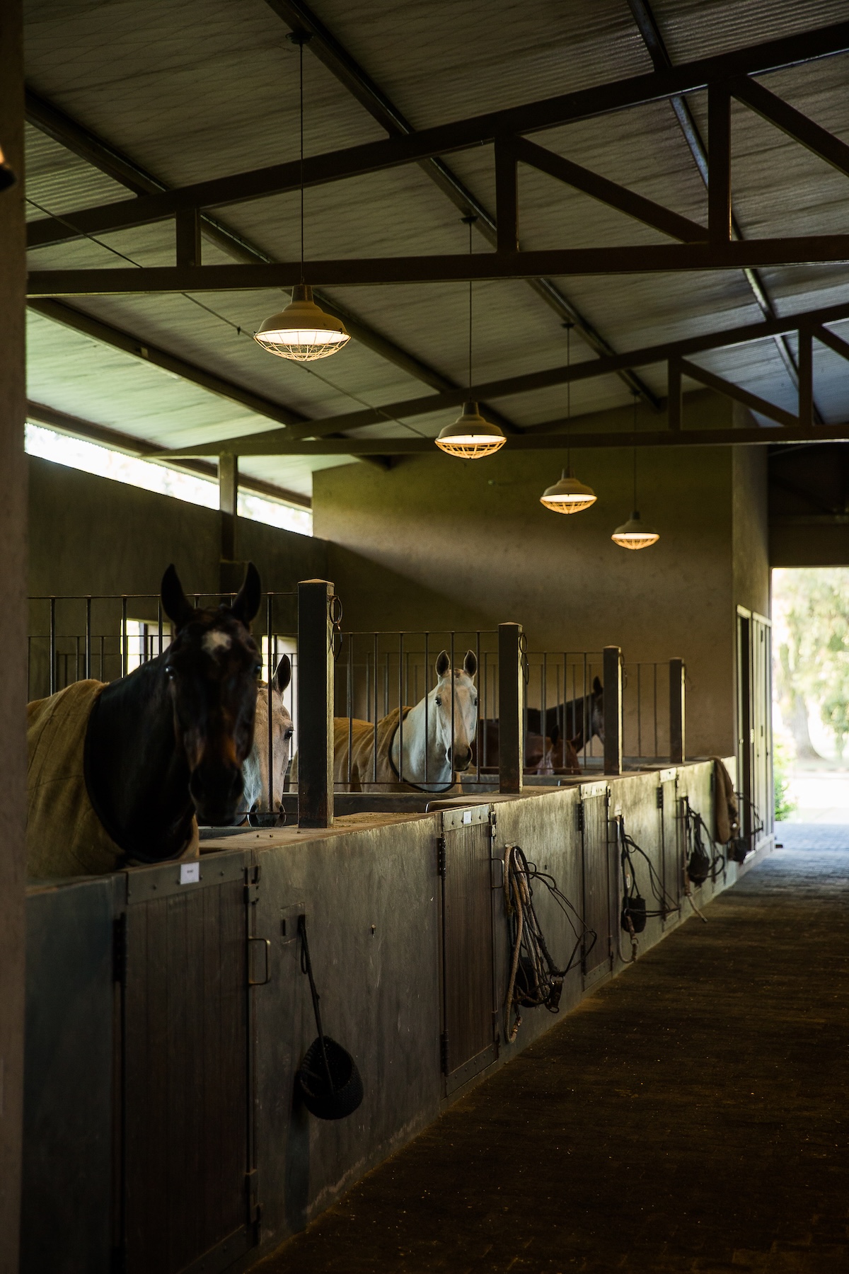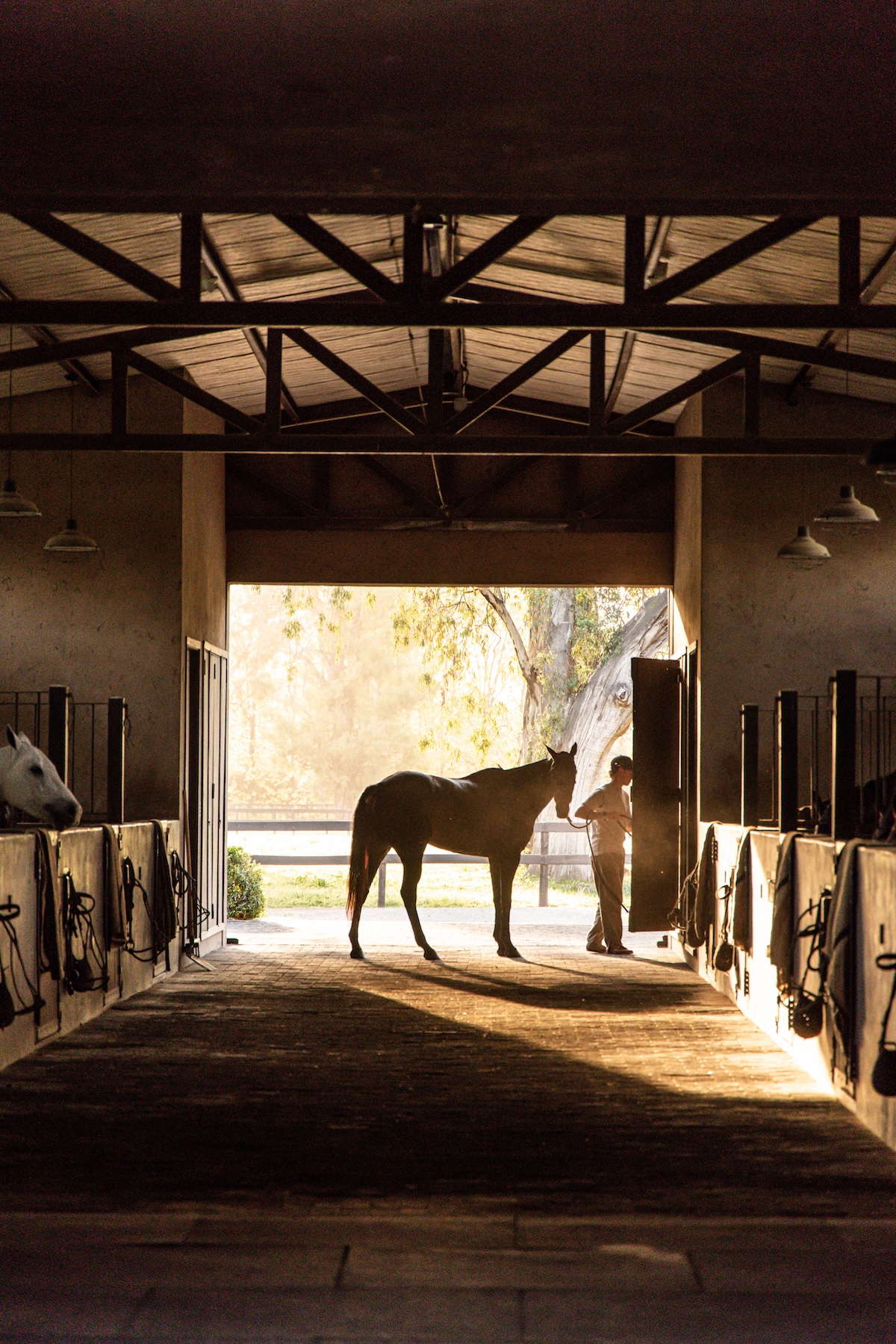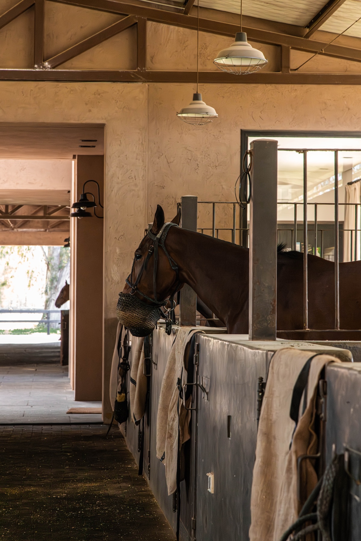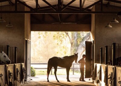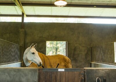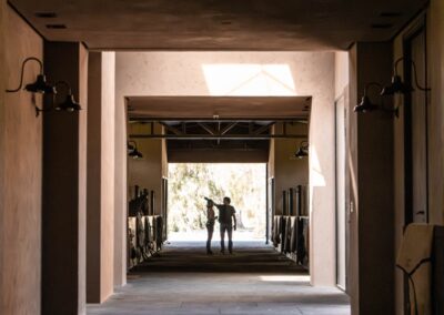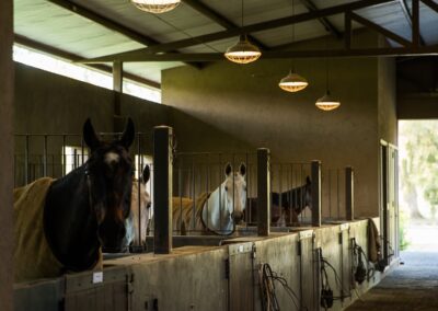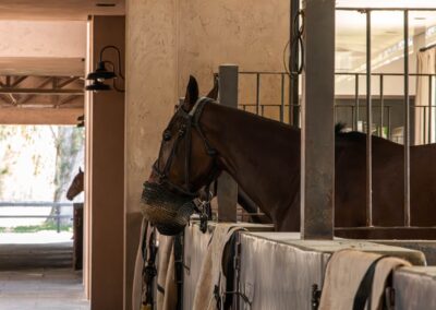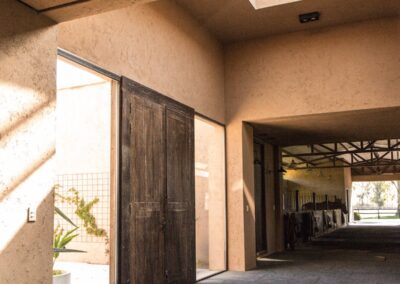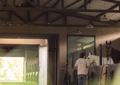 La caballeriza principal fue diseñada como una estructura de pasillo central, típica del estilo galpón, en la cual cuenta con una gran área social central, un monturero principal y montureros de servicio, un gimnasio, una veterinaria y todos los servicios. El desafío fue crear una caballeriza de nivel, transformando una tipología simple en un proyecto con identidad y carácter propio. Para ello se diseñaron pórticos en sus esquinas que estructuran y jerarquizan el conjunto. Estos pórticos se convirtieron no solo en la identidad del estudio, sino que hoy son fuente de inspiración para numerosas caballerizas, ya que introdujeron un nuevo lenguaje arquitectónico en la arquitectura ecuestre.