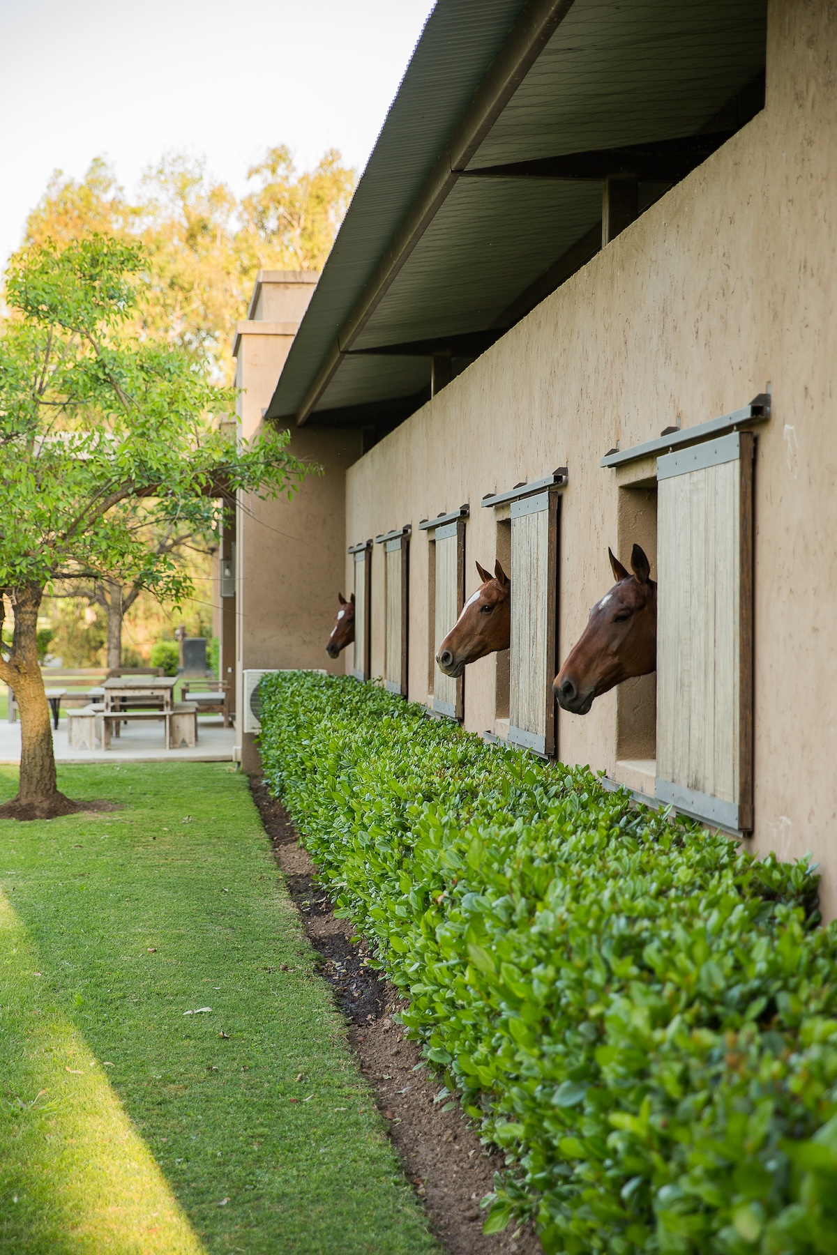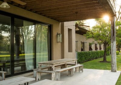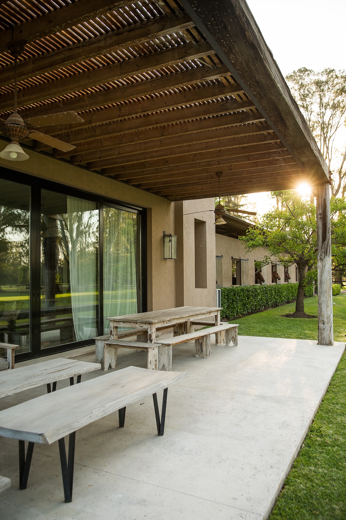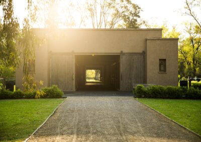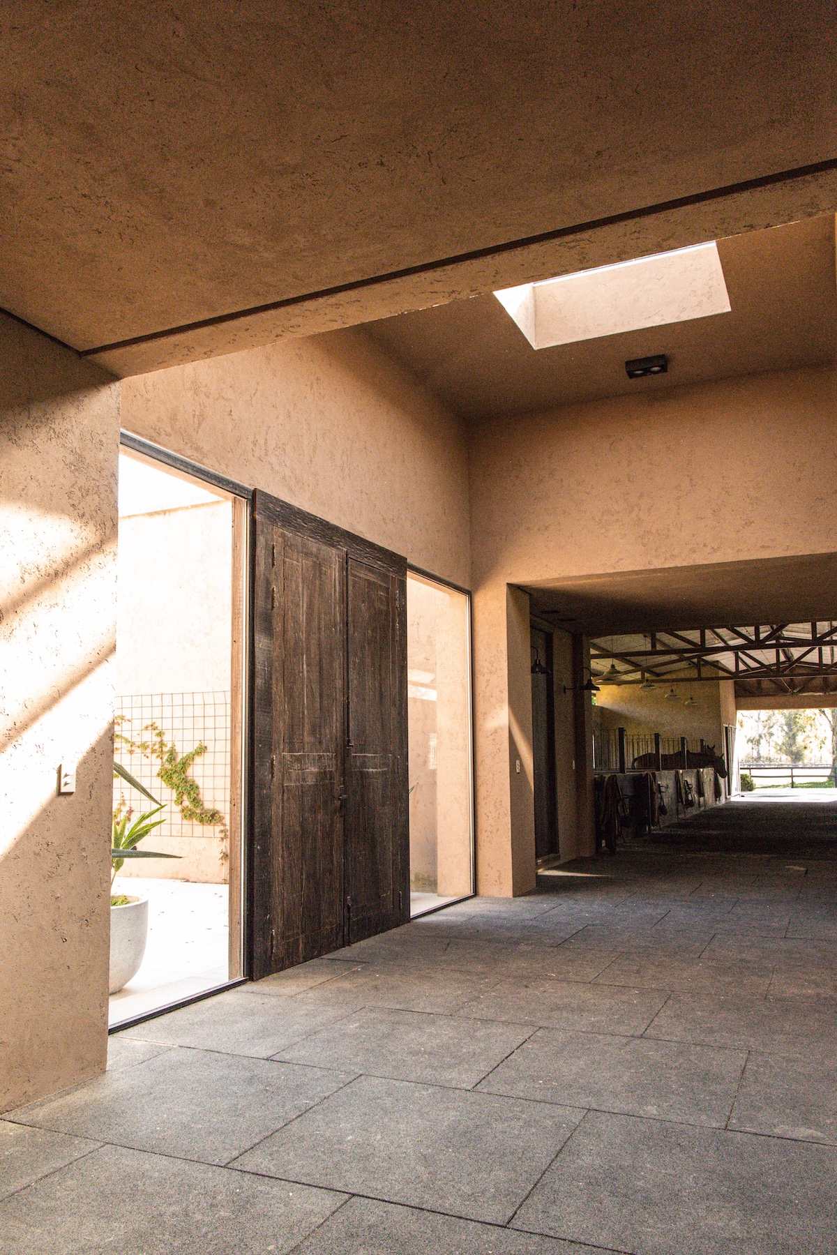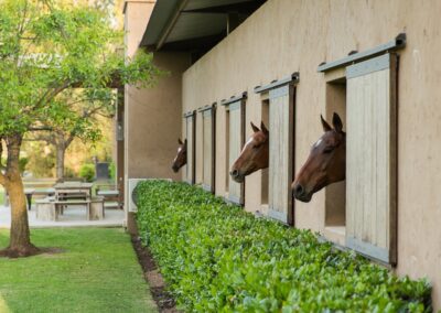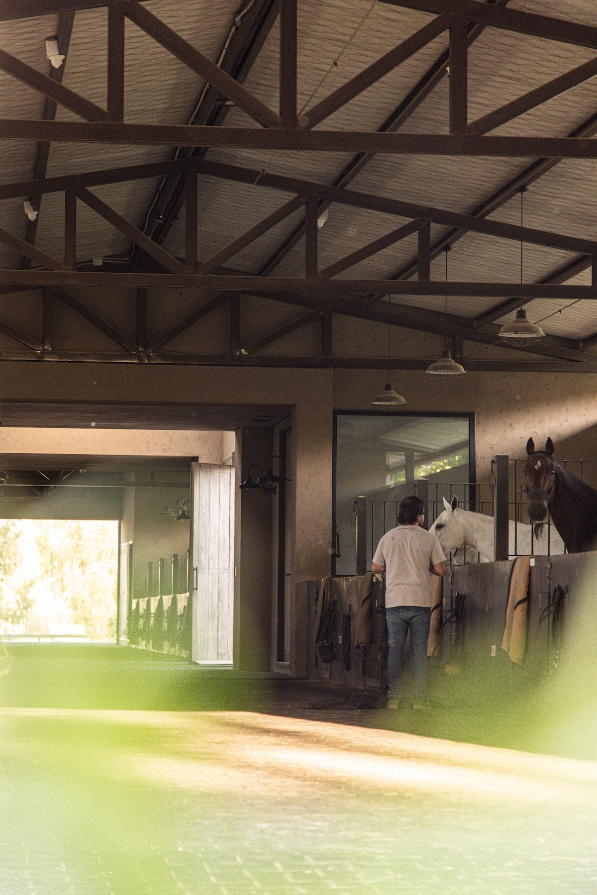 La caballeriza principal fue diseñada como una estructura de pasillo central, típica del estilo galpón, en la cual cuenta con una gran área social central, un monturero principal y montureros de servicio, un gimnasio, una veterinaria y todos los servicios. El desafío fue crear una caballeriza de nivel, transformando una tipología simple en un proyecto con identidad y carácter propio. Para ello se diseñaron pórticos en sus esquinas que estructuran y jerarquizan el conjunto. Estos pórticos se convirtieron no solo en la identidad del estudio, sino que hoy son fuente de inspiración para numerosas caballerizas, ya que introdujeron un nuevo lenguaje arquitectónico en la arquitectura ecuestre.